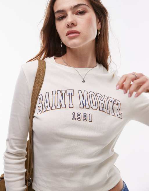 Topshop - T-shirt effet rétréci à manches longues et inscription « Saint Moritz » - Ivoire