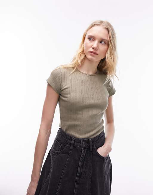 Topshop - T-shirt en maille pointelle et dentelle - Kaki