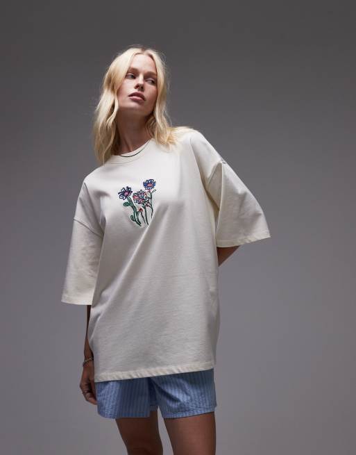 Topshop - T-shirt oversize avec fleurs brodées - Écru