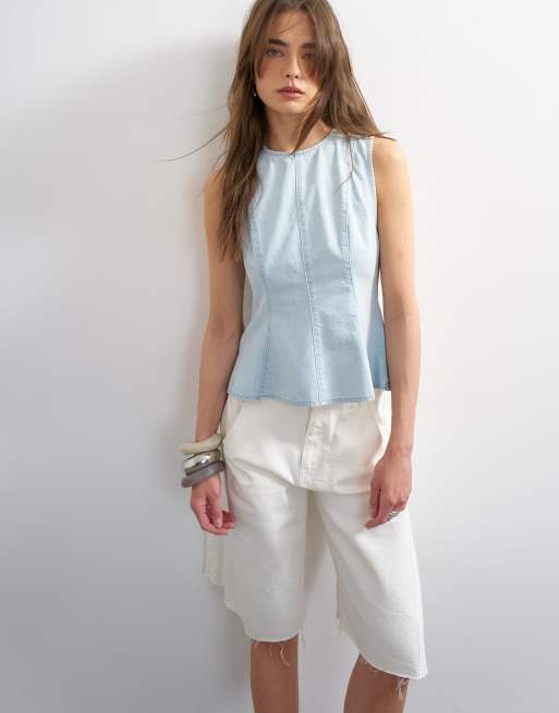 Topshop - Top à basque en denim délavé à surpiqûres