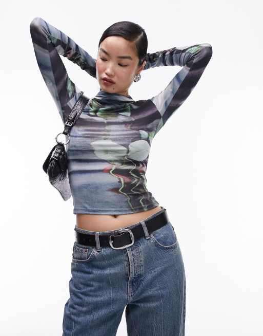 Topshop - Top à manches longues et encolure montante à imprimé fleurs style grunge - Ardoise