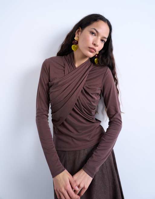 Topshop - Top croisé style cache-cœur à manches longues - Marron chocolat