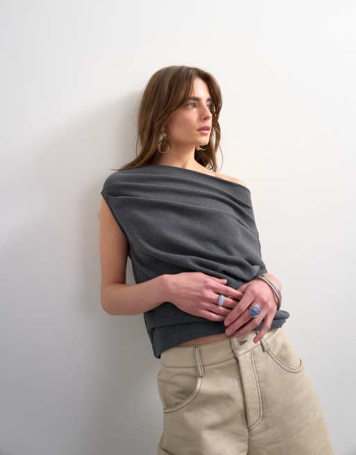 Topshop - Top doux au toucher avec épaule tombante - Gris