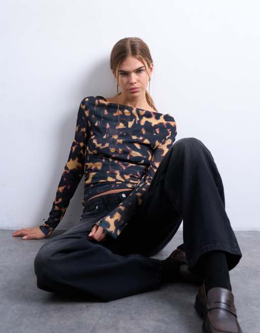 Topshop - Top en tulle à manches longues et col bénitier avec imprimé écaille de tortue - Noir