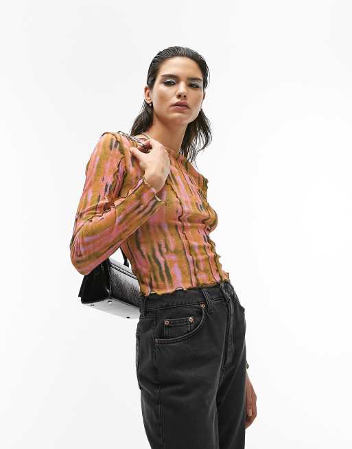 Topshop - Top surpiqué en tulle à manches longues avec imprimé style peinture en spray