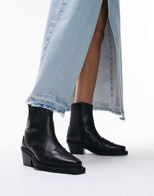 Topshop Wide Fit - Lena - Bottines style santiags en cuir - Noir