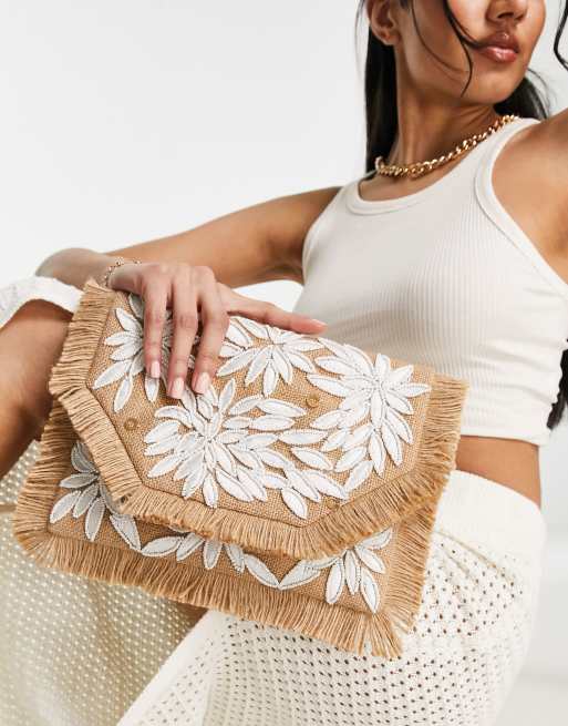 True Decadence - Pochette enveloppe en paille avec fleurs brodées - Blanc et paille