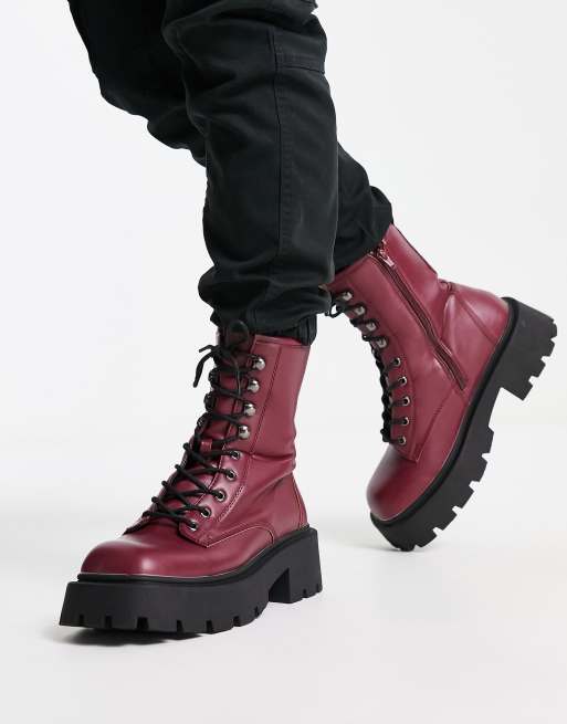Truffle Collection - Bottines chunky imitation cuir à bout carré et lacets - Bordeaux