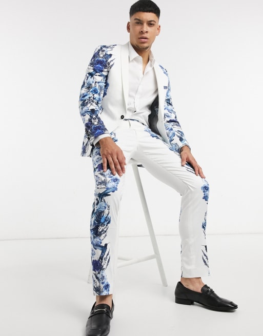 Twisted Tailor - Costume à imprimé floral effet miroir - Blanc et bleu