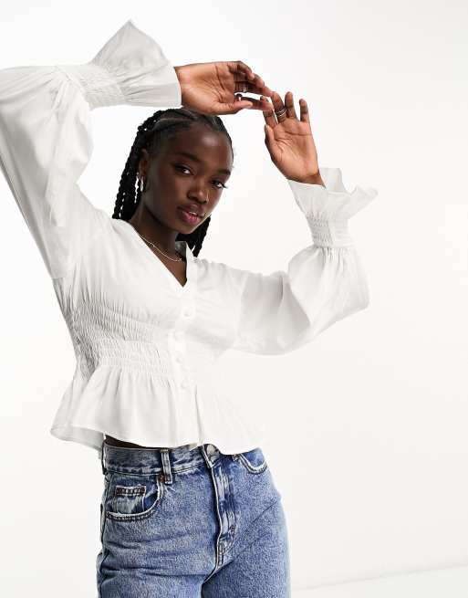 Urban Revivo - Blouse boutonnée sur le devant à basque - Blanc