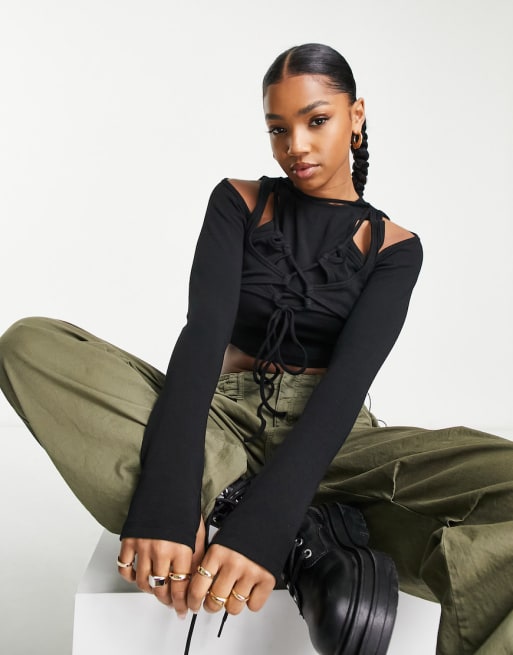 Urban Revivo - Ensemble avec crop top à découpes aux épaules et mini-jupe à détail string - Noir