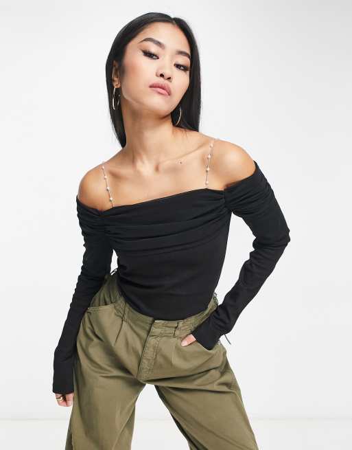 Urban Revivo - Top froncé à manches longues et épaules dénudées - Noir