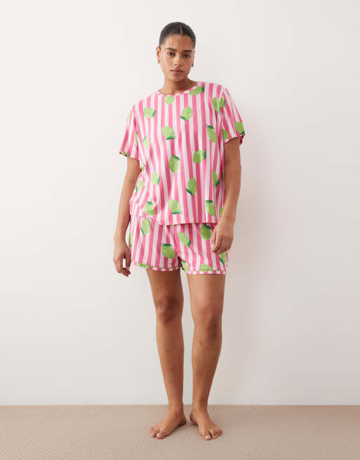 Urban Threads Curve - Ensemble de pyjama en jersey avec short et t-shirt à rayures et imprimé citrons - Rose