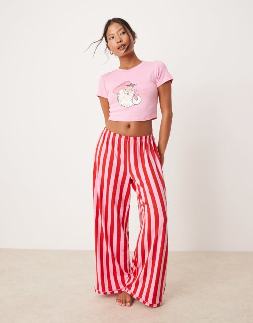 Urban Threads Petite - Pyjama de Noël en polyester t-shirt à manches courtes avec imprimé père Noël cow-boy et pantalon à rayures - Rose et rouge