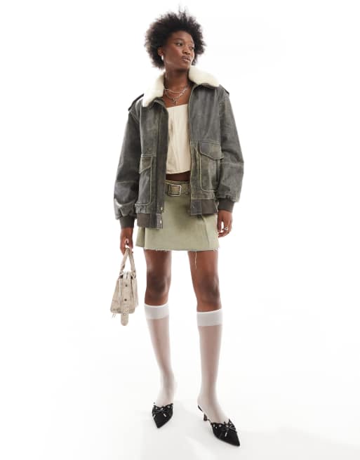 Urbancode - Blouson aviateur en cuir avec col imitation peau de mouton - Marron intense