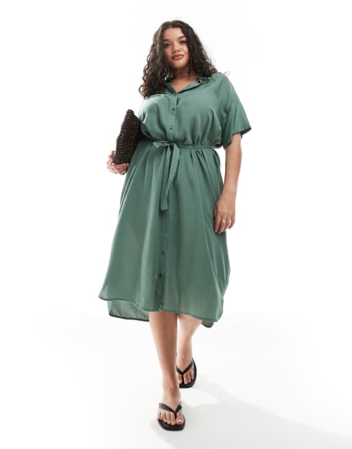 Vero Moda Curve - Robe chemise mi-longue avec ceinture nouée - Vert