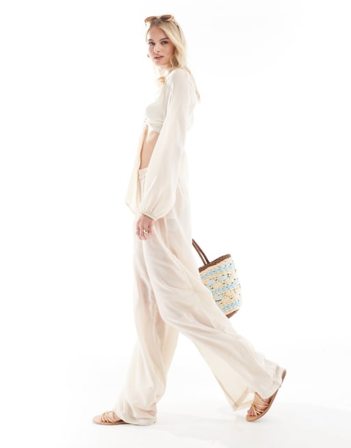 Vero Moda Tall - Ensemble de plage top noué sur le devant et pantalon - Taupe