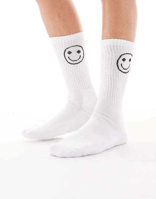 Vero Moda - Chaussettes de sport côtelées à motif smiley - Blanc et chocolat