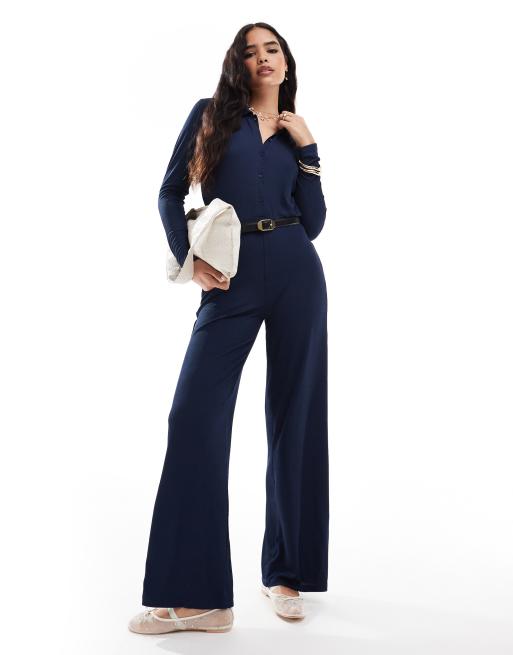 Vero Moda - Combinaison boutonnée à l'avant en jersey avec col - Bleu moyen