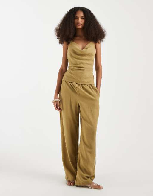 Vero Moda - Pantalon ample à taille haute en tissu aspect lin d'ensemble - Vert saule