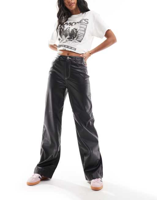 Vero Moda - Pantalon dad ample en similicuir avec coutures contrastantes blanches - Noir