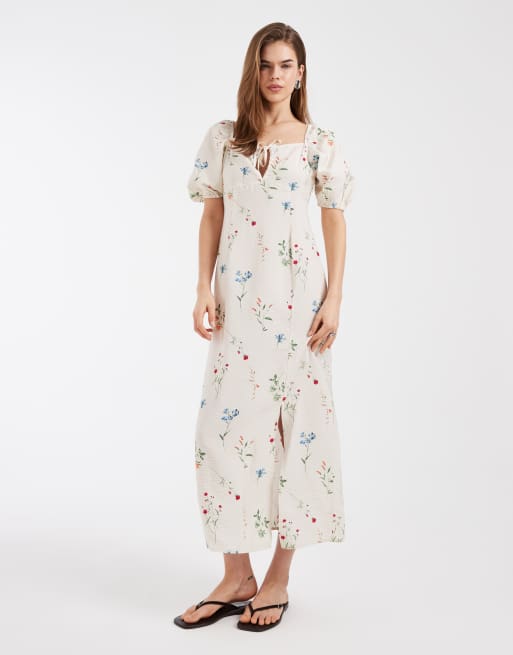Vero Moda - Robe longue à imprimé fleuri à manches bouffantes et détail noué à l'avant - Crème