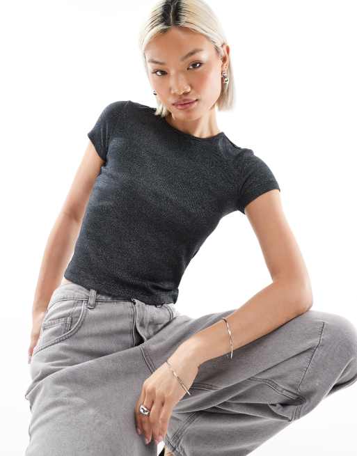 Vero Moda - T-shirt raccourci - Noir à paillettes argentées