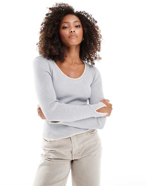 Vero Moda - Top en maille avec encolure dégagée et bordures contrastantes - Gris clair chiné