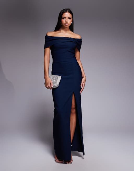 Vesper - Robe longue cintrée à la taille en bengaline avec encolure Bardot large et fente latérale - Bleu marine