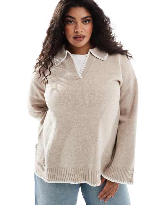 Vila Curve - Pull à col V ouvert avec coutures contrastantes - Beige