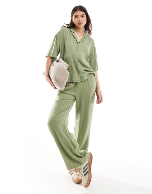 Vila - Ensemble chemise et pantalon noué à la taille aspect lin - Vert