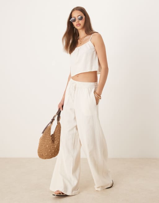 VILA - Ensemble en aspect lin avec pantalon ample et caraco - Crème