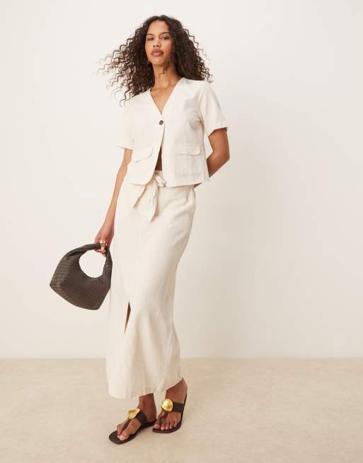 VILA - Jupe longue d'ensemble fendue devant à taille haute en aspect lin - Crème chiné