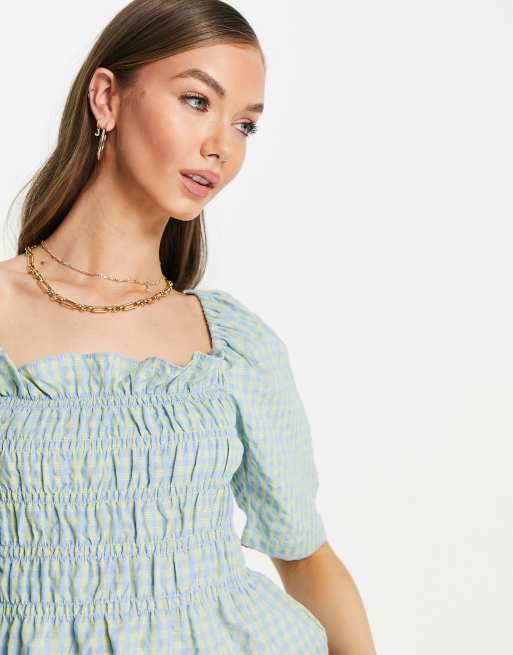 Vila - Top smocké à manches courtes et encolure carrée à carreaux vichy