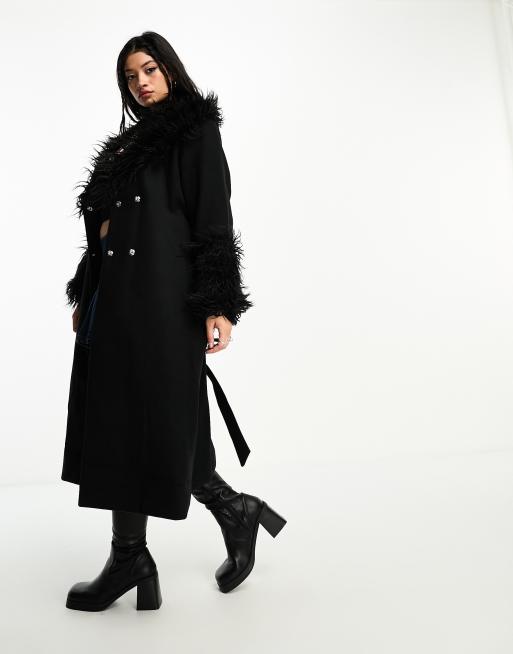Violet Romance Plus - Manteau long à ceinture et détails en fausse fourrure - Noir