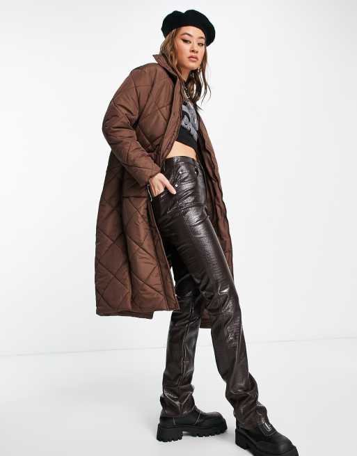 Violet Romance - Doudoune longue matelassée à losanges avec col cheminée - Chocolat/marron