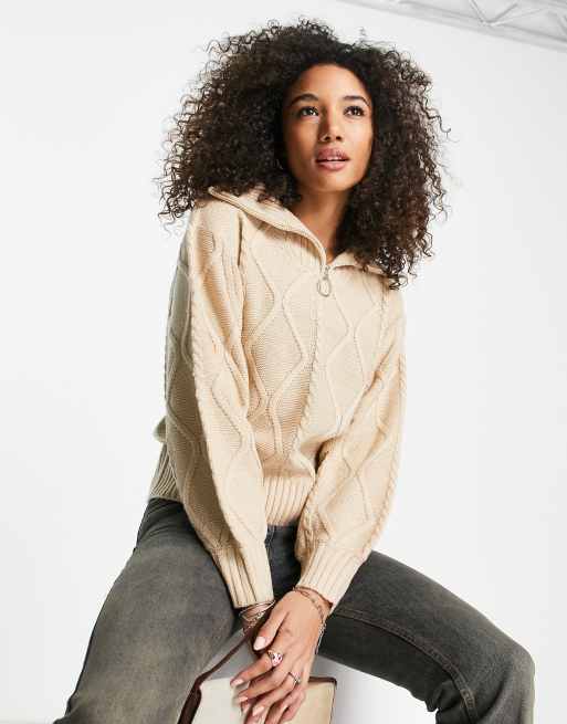 Violet Romance - Pull en maille torsadée à demi-fermeture éclair - Grège