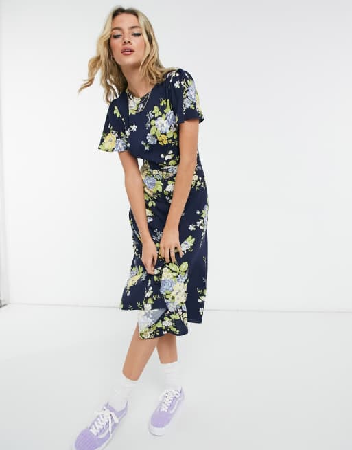 Warehouse - Bonnie - Robe mi-longue à motif rose - Bleu