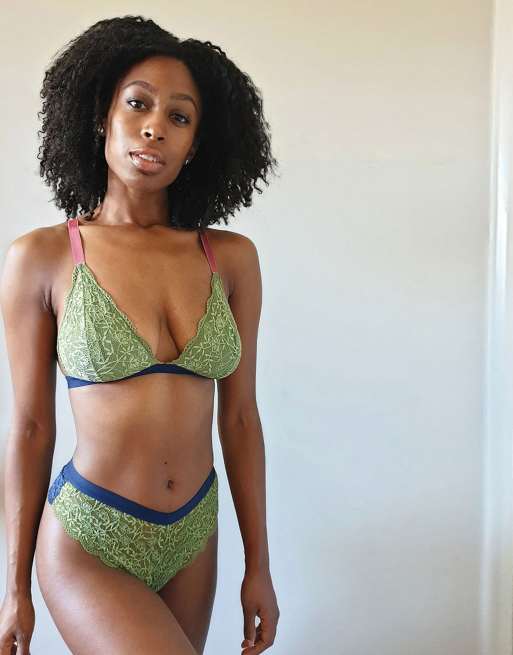 We Are We Wear - Brassière triangle à bretelles fines en dentelle - Kaki et bleu marine