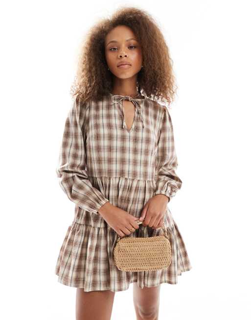 Wednesday's Girl - Robe babydoll courte à carreaux avec liens - Beige
