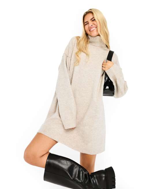 Exclusivité ASOS - Weekday - Annie - Robe pull courte en maille de laine mélangée à col roulé - Beige chiné