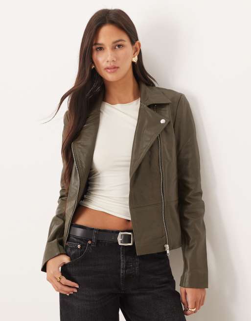 YAS - Blouson style motard en cuir haut de gamme - Vert olive