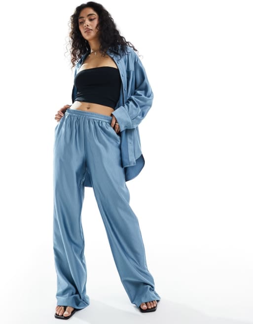 Y.A.S - Ensemble satiné avec pantalon ample et chemise oversize à fines rayures - Bleu