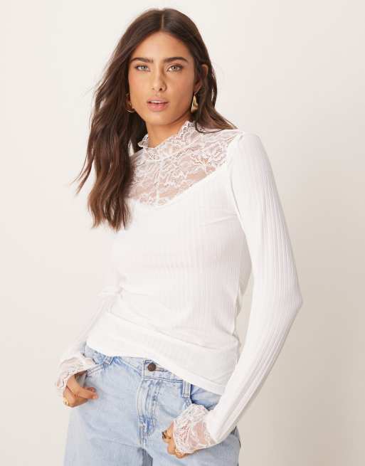 YAS - Top à col montant en dentelle style victorien - Blanc