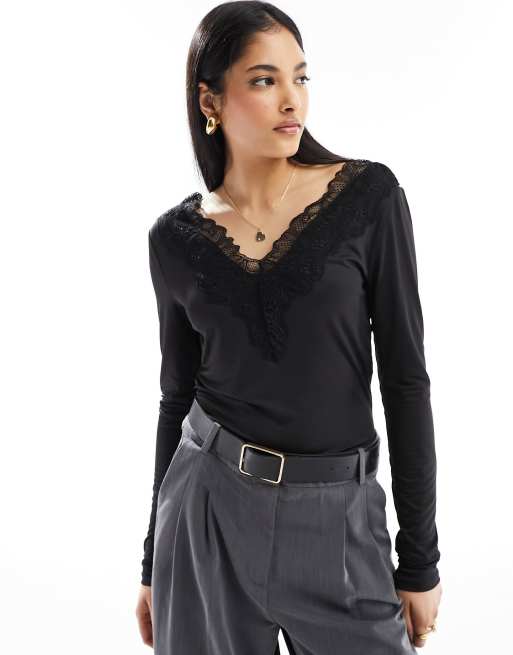 Y.A.S - Top manches longues avec col V bordé de dentelle - Noir