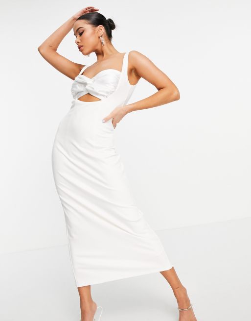 Yaura - Robe mi-longue effet satiné avec buste torsadé à découpe et fente sur la cuisse - Ivoire