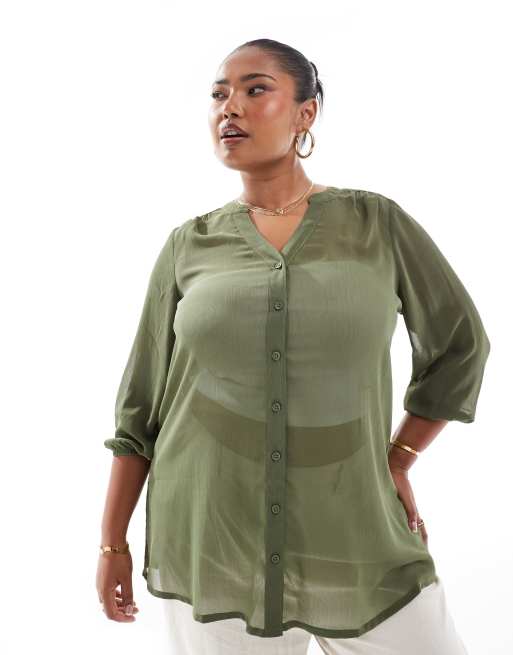 Yours - Blouse transparente en crêpe avec encolure à encoche - Kaki