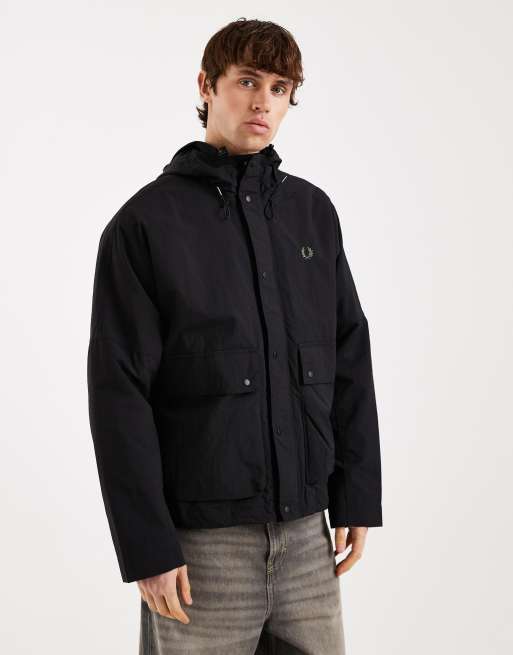 Fred Perry cropped ripstop logo hooded parka jacket in black