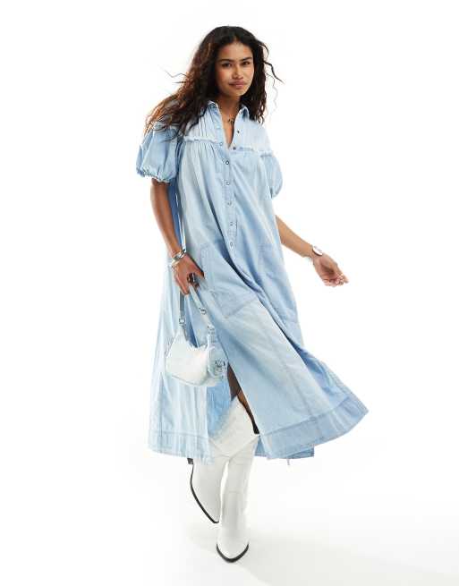 Free People button front puff sleeve midi dress in blue denim