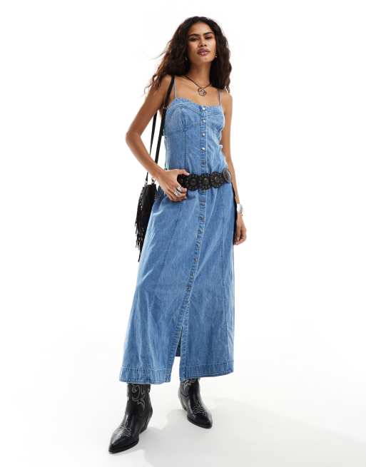 Free People button through denim maxi dress in blue